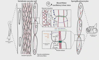 A hallmark of animals is the coordination of whole-body movement. Neurons and muscles are central to this, yet coordinated movements also exist in sponges that lack these cell types. Sponges are sessile animals with a complex canal system for filter-feeding. They undergo whole-body movements resembling “contractions” that lead to canal closure and water expulsion. Here, we combine live 3D optical coherence microscopy, pharmacology, and functional proteomics to elucidate the sequence and detail of shape changes, the tissues and molecular physiology involved, and the control of these movements. Morphometric analysis and targeted perturbation suggest that the movement is driven by the relaxation of actomyosin stress fibers in epithelial canal cells, which leads to whole-body deflation via collapse of the incurrent and expansion of the excurrent canal system. Thermal proteome profiling and quantitative phosphoproteomics confirm the control of cellular relaxation by an Akt/NO/PKG/PKA pathway. Agitation-induced deflation leads to differential phosphorylation of proteins forming epithelial cell junctions, implying their mechanosensitive role. Unexpectedly, untargeted metabolomics detect a concomitant decrease in antioxidant molecules during deflation, reflecting an increase in reactive oxygen species. Together with the secretion of proteinases, cytokines, and granulin, this indicates an inflammation-like state of the deflating sponge reminiscent of vascular endothelial cells experiencing oscillatory shear stress. These results suggest the conservation of an ancient relaxant-inflammatory response of perturbed fluid-carrying systems in animals and offer a possible mechanism for whole-body coordination through diffusible paracrine signals and mechanotransduction.